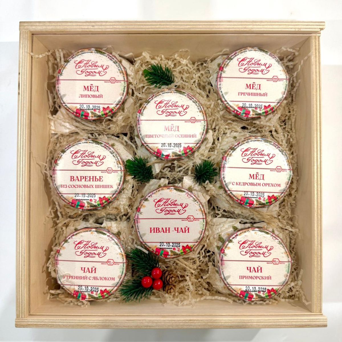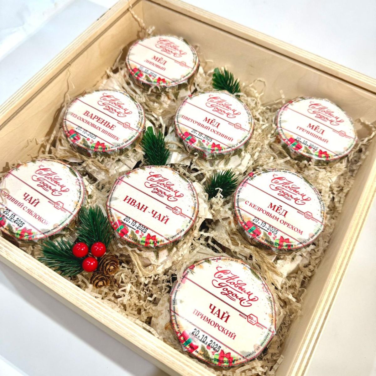 8 стеклянных банок по 250 мл. Мёд липовый, таёжный, цветочный осенний, мёд с кедровым орехом, варенье из сосновых шишек, чай цветочный, приморский, иван-чай, деревянная коробка с крышкой, декор.
