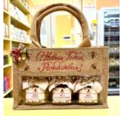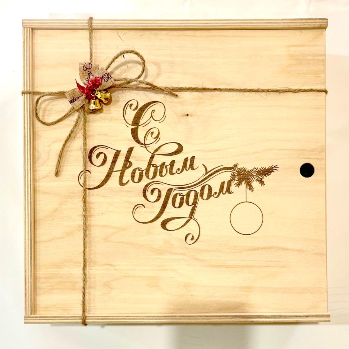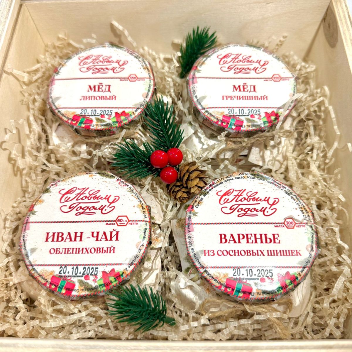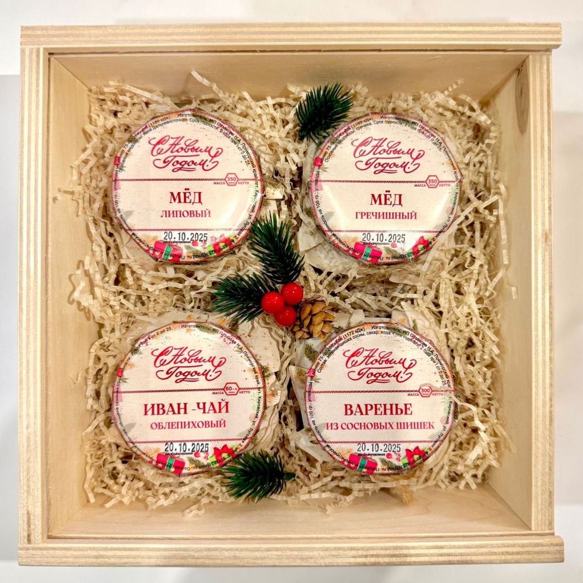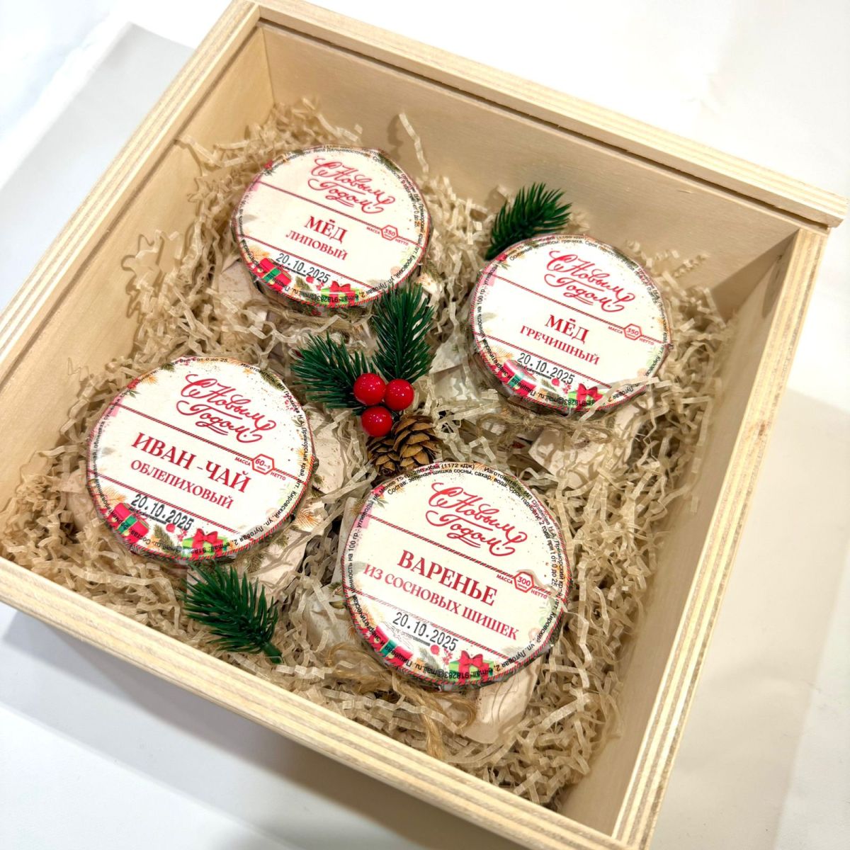 4 стеклянные банки 250 мл. Мёд липовый, мёд гречишный, иван-чай облепиховый, варенье из сосновых шишек, деревянная коробка с крышкой, декор