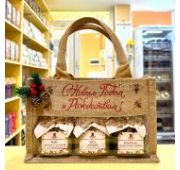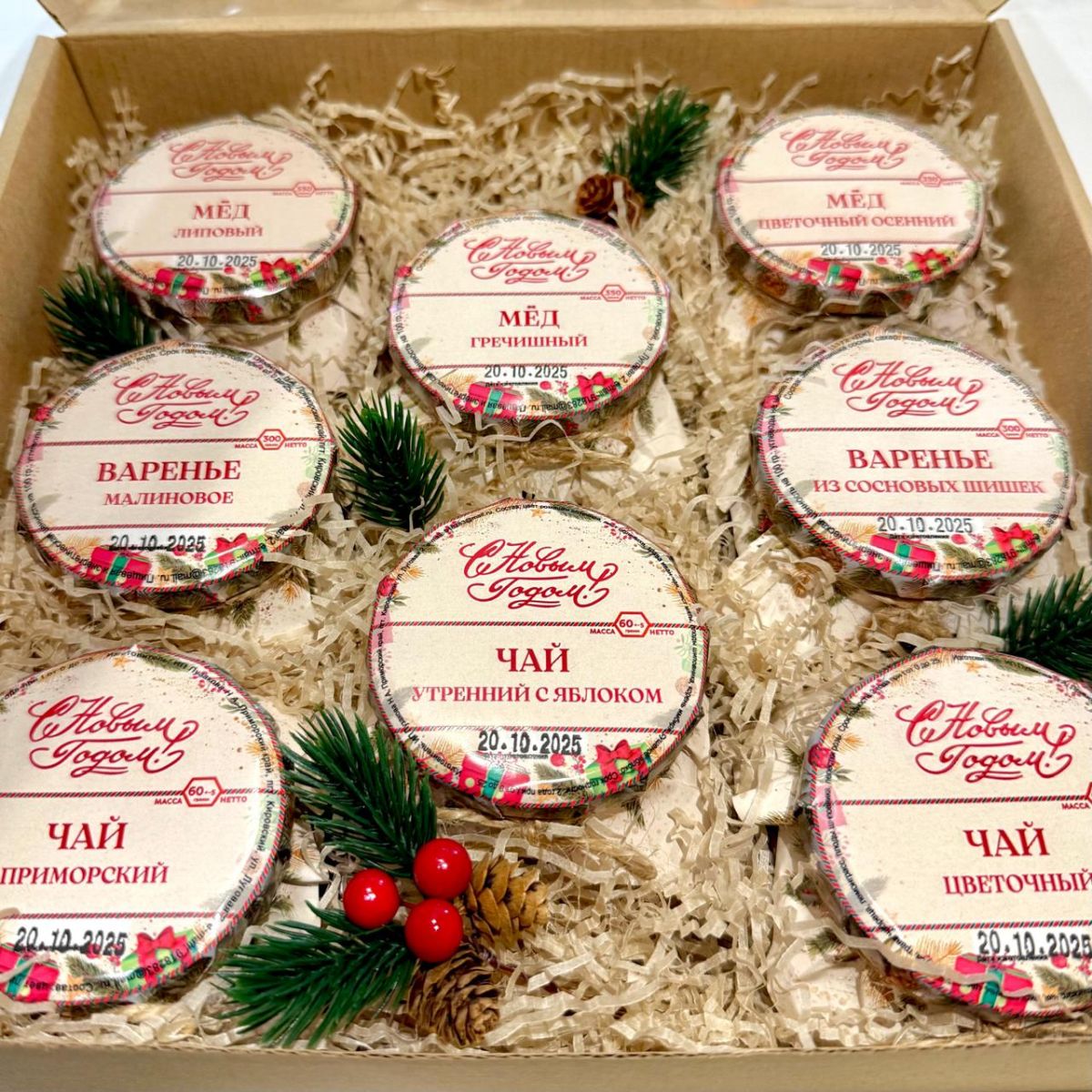 8 стеклянных банок по 250 мл. Мёд липовый, таёжный, гречишный, малина протертая с сахаром, варенье из сосновых шишек, чай цветочный, приморский, утренний, картонная коробка, декор.