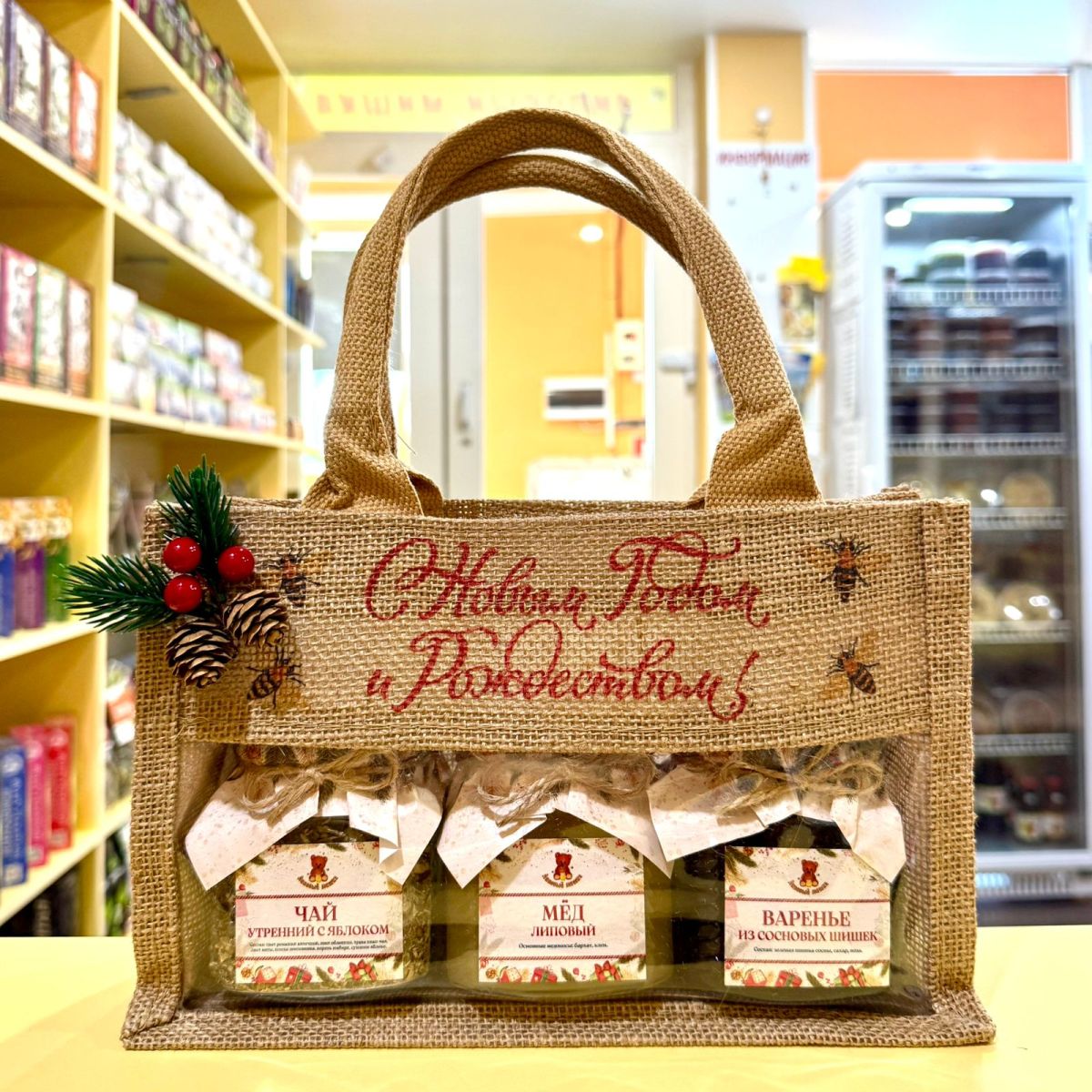 3 стеклянные банки по 250 мл. Мёд липовый, чай утренний с яблоком, варенье из сосновых шишек, сумка с Новым Годом, декор.