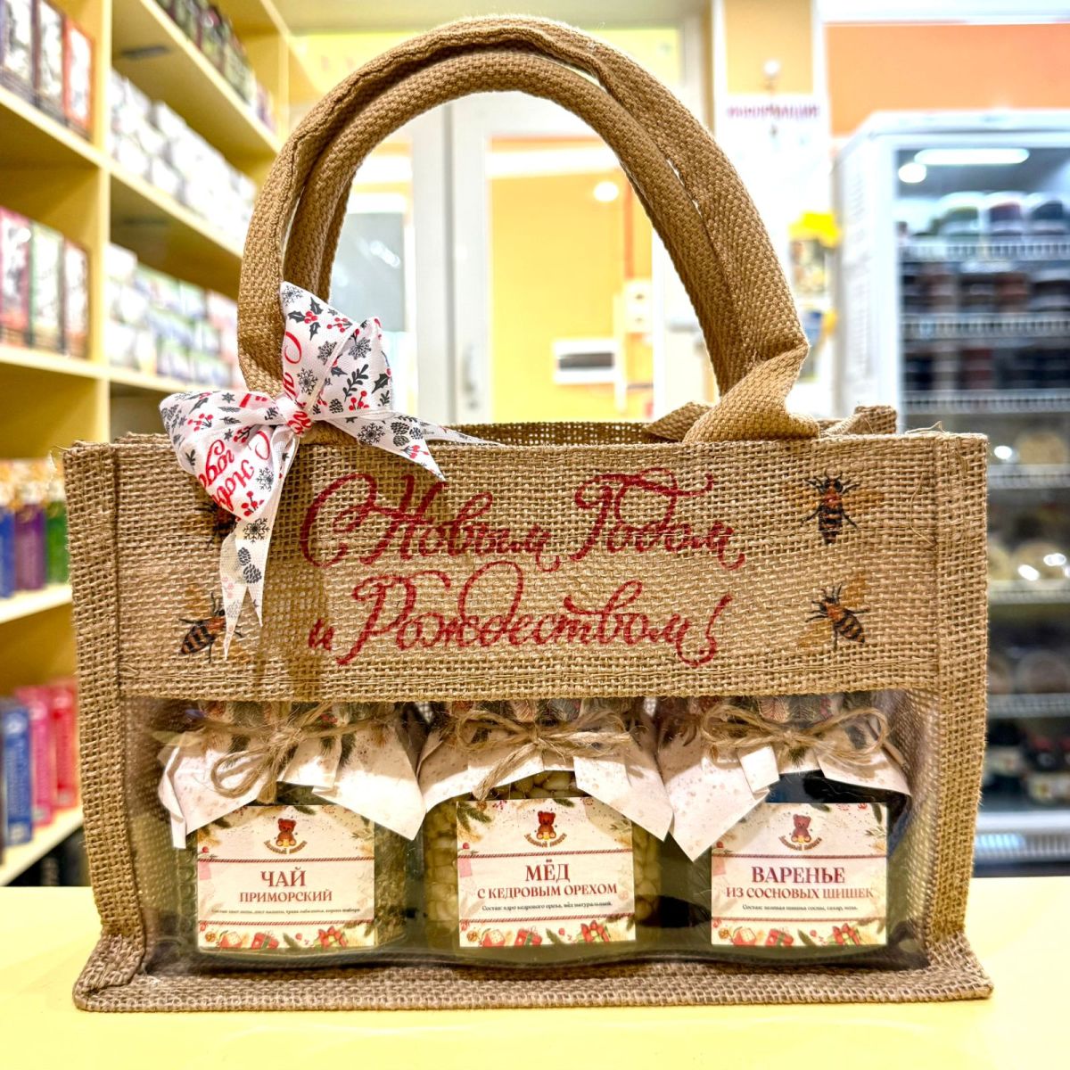 3 стеклянные банки по 250 мл. Мёд липовый с кедровым орехом, чай приморский, варенье из сосновых шишек, сумка с Новым Годом, декор.